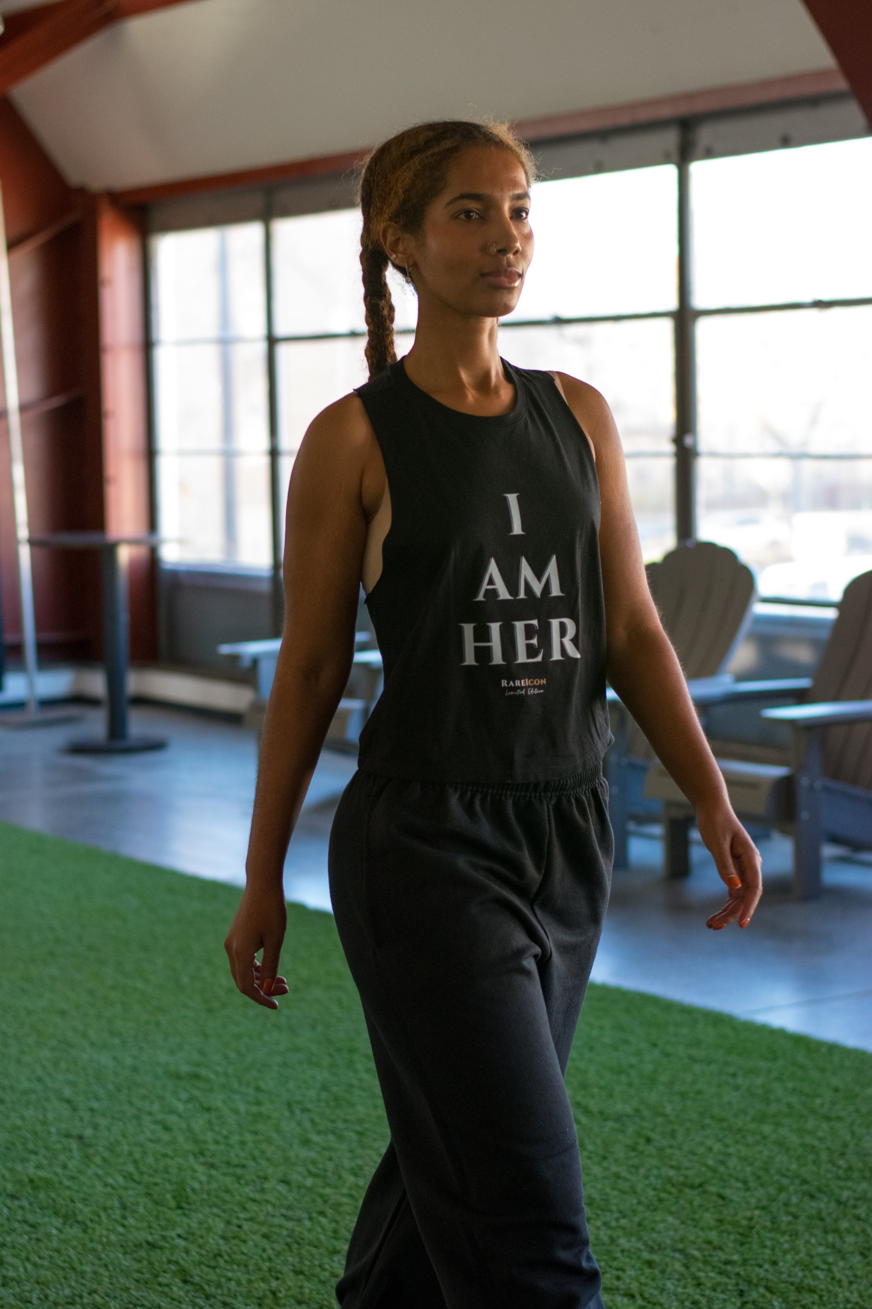 The I AM HER Racerback in black combines a sleek design with a comfortable fit, featuring a racerback style and a slight crop for a versatile look. Ideal for casual wear or active settings, it offers both style and functionality.